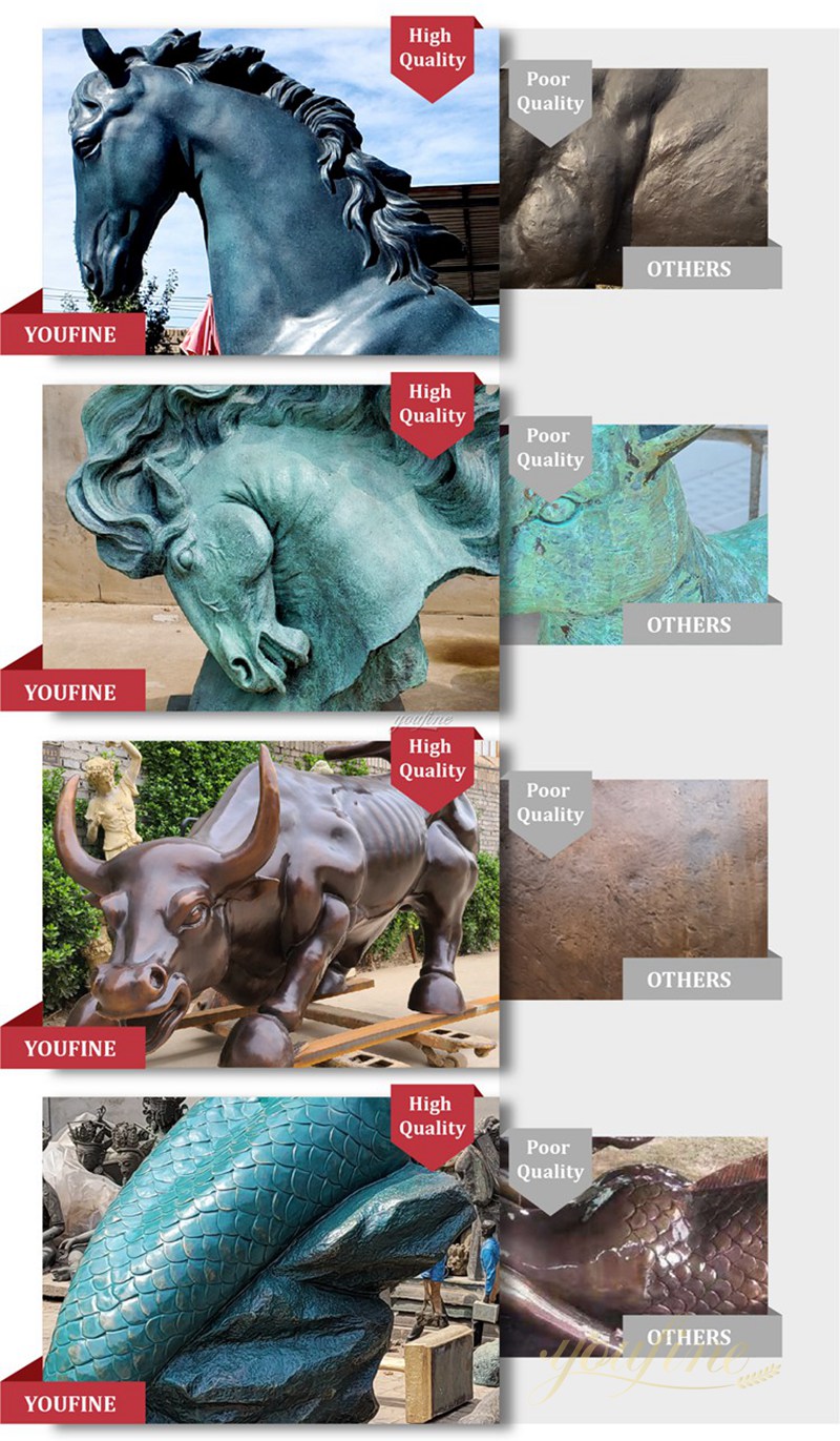 This magnificent sculpture is cast using time-honored bronze casting methods perfected over YouFine’s 40 years of sculpting mastery. Molten bronze is poured into molds, then hand-finished by artisans once cooled and hardened. This allows for the fluid look of the rippling muscles, the dynamic flow of the mane and tail, and the textural details that inject realism. The bronze develops a handsome aged patina over time.
