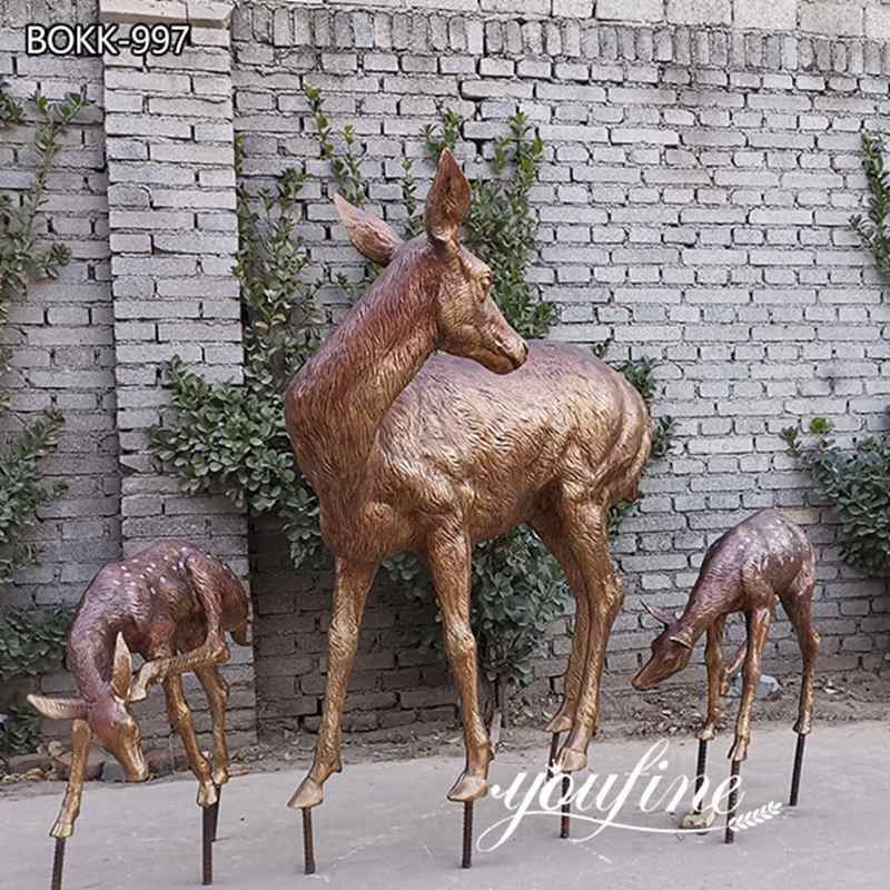 This set of statues are made of bronze material. It includes one doe statue and two fawn statues. The facial expressions of the bronze garden deer statue are warm and gentle, and the facial expressions of the bronze fawn statues are very lovely. The two fawn statues are eating grass while the doe statue is observing around to protect her babies. If you put this set statue on the lawn, it would be more vivid.