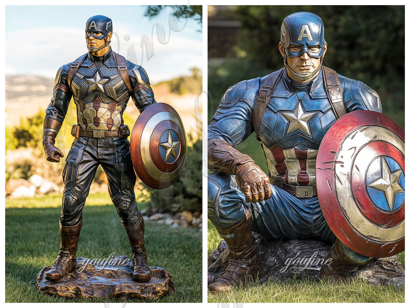 The life size bronze Captain America statue presents a unique brown color through patina. This color gives the statue a retro and calm texture with a unique charm. Also this color is not easy to fade and will become more natural over time.