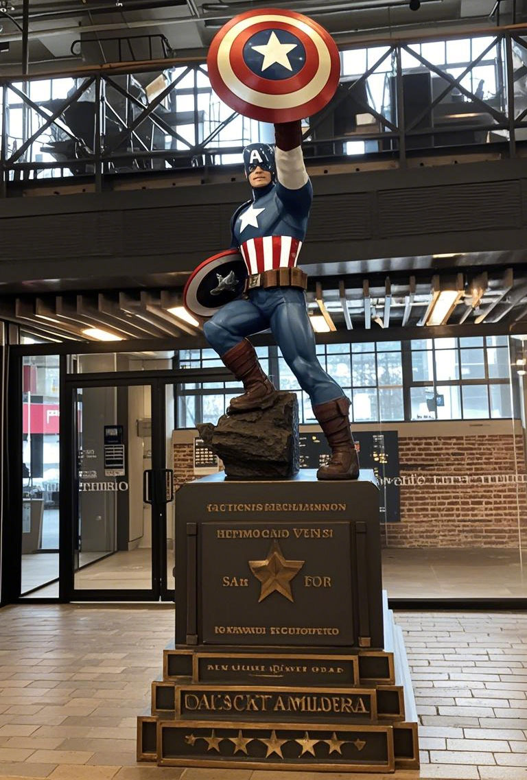 He is wearing his iconic battle suit, the folds on the suit are lifelike, and every line accurately restores the shape in the movie. The shield is raised high, and the eye-catching five-pointed star on the shield is shining. His facial expression is firm and resolute, and his eyes reveal fearlessness and justice, guarding the peace of the world.